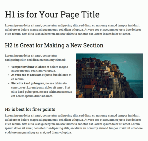 These sub-headers not only help readers navigate the page, they'll help search engines find your content. Use one large (H1) heading at the top of each page, use medium (H2) headings to separate your main content, and use small (H3) headings for any minor points.